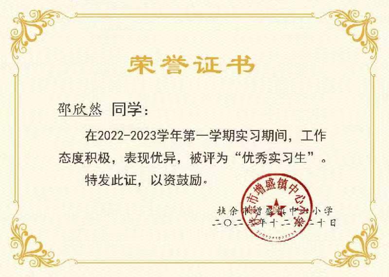 邵欣然系十大信誉官网英语专业2019级学生,在扶余市增盛镇小学实习期间主要负责五年一、二班的英语课程及三至五年级音乐课程教学工作,同时担任学校少先队兼职辅导员,协助德育处开展学团工作。感谢信提到,邵欣然同学团结同志,敢于吃苦,虚心好学,服从学校领导安排的各项工作任务和要求,严格执行实习生守则,工作主动认真,能够积极完成各项工作任务,具有良好的师德修养,受到学校师生和领导的一致好评,并授予邵欣然同学“优秀实习生”荣誉。(审核人:罗学锋)