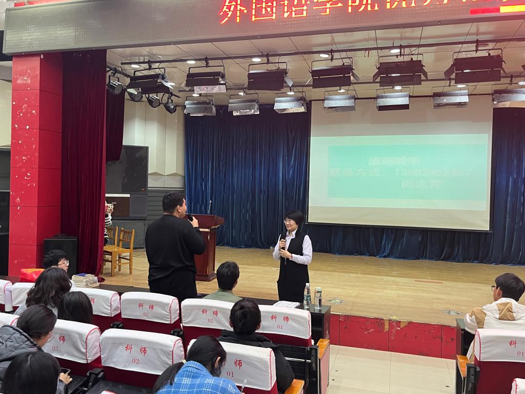 “雏既壮而能飞兮,乃衔食而反哺”。为进一步提升学生专业能力和综合素养,秉承“外语+”应用型人才培养理念,充分体现外语的“学以致用”原则,提升学生用外语“讲好中国故事”的意识和能力,增强文化自信,澳门十大信誉好的网站于11月8日邀请优秀校友尚志芹(河北建材职业技术学院副教授、对外汉语教学国际汉语高级教师、国家高级英文导游员、河北省英语导游考官、河北省“师德标兵”、全国第十三批援藏导游员西藏自治区“先进个人”)在开发区校区综合楼二楼报告厅进行针对教师资格证和外语导游考试的讲座。