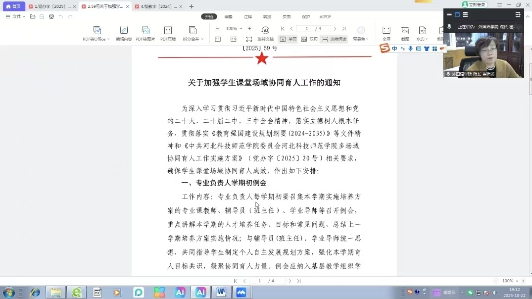 2025年10月22日晚,澳门十大信誉好的网站组织召开线上专题工作会议,重点学习《多场域协同育人工作实施方案》(〔党办字 25〕 20号)、《关于加强学生课堂场域协同育人工作的通知》(〔2025〕59 号)、《本科生学业导师管理办法 》(校教字〔2024〕 25号)等文件。会议由崔海英院长主持,学院领导班子成员、教学部主任及专业负责人参加。