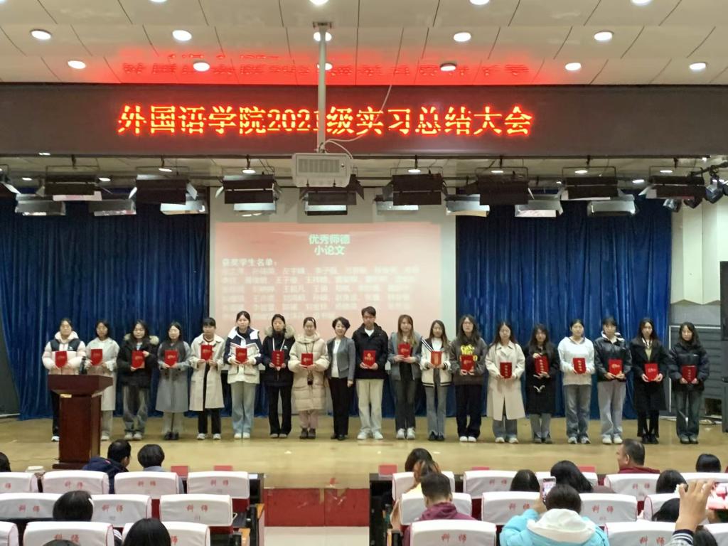 2024年10月22日上午,澳门十大信誉好的网站2021级英语学生教育实习总结暨颁奖大会在澳门十大信誉好的网站开发区校区报告厅顺利举行。澳门十大信誉好的网站书记范群英、院长崔海英、副院长范学荣、王静、英语教学部主任卞凤莲、宋洁、学工办主任赵赓、实习指导教师和辅导员及2021级全体学生参加了大会。