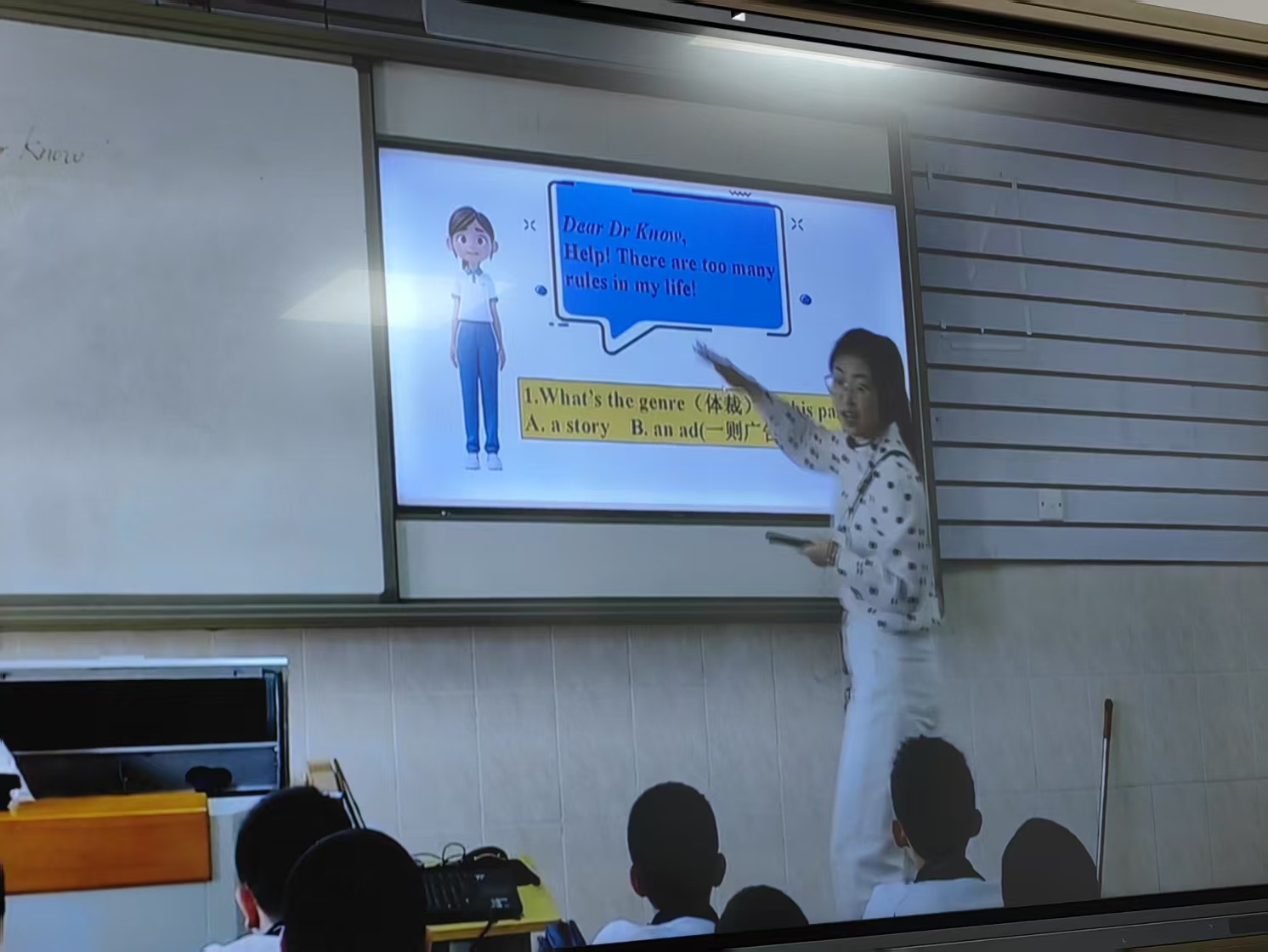 郑雨楠老师讲授的是七年级下册Unit2 No Rules, No Order Section B 1a-1c阅读课。在课程讲授过程中,郑雨楠老师利用数字人技术作为教学的主线,使阅读文本中的Dr. Know跳脱出课本,激发学生的学习兴趣,带领学生对阅读文本进行探索。