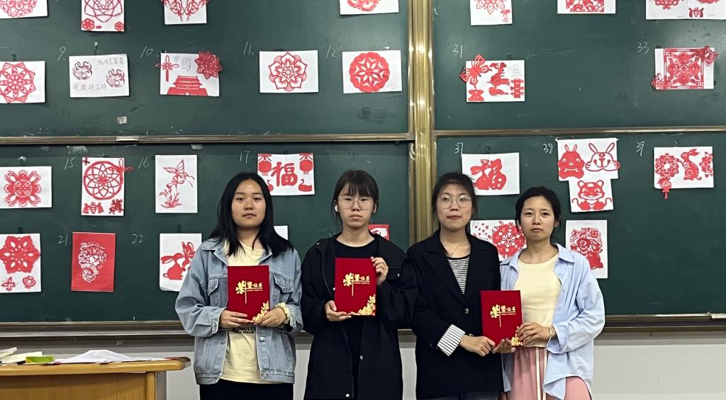 本次比赛共有44组选手参与。在比赛过程中,参赛选手时而认真思考,时而剪刀上下摆动,人人都凭着心灵手巧“秀”出自己的“绝活儿”。小巧的剪刀在他们的指尖轻盈地旋转、舞蹈,左旋右转之间,一个个精美的图案便跃然纸上。一张张红色的纸张就这样变成了充满艺术气息、饱含生活情趣、寄托心之向往的精美艺术品。比赛结束后,工作人员与参赛选手根据投票规则对作品进行投票。经过评选,张司诺组、贺青组获得一等奖,王雨萌组等三组同学获得二等奖,孙瑞英组等四组同学获得三等奖,卢雨欢组等十组同学获得参与奖。