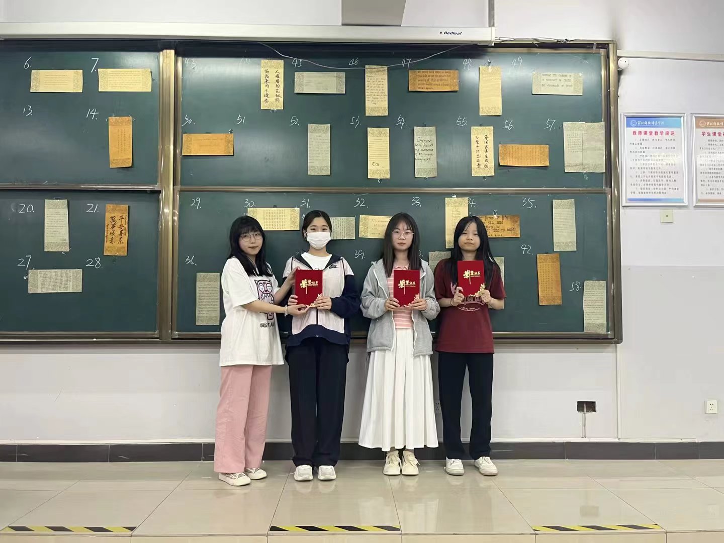 活动现场,在书写的沙沙声中,选手们屏气凝神,挥毫泼墨,肆意发挥,全力投入,精心书写,经过一段时间的书写,作品或气质敦和浑厚、骨坚内润,或雍容大方、舒展开阔,或端正俊丽、圆转流美,或运笔纯正、雄健有力尽显毛笔的洒脱……参赛选手们用自己的作品展示了书法的魅力和书法独特的风格。经过评委与参赛组组长的共同投票,王祎晗、贺青获得一等奖,张司诺等三名同学获得二等奖,王晨曦等四名同学获得三等奖。