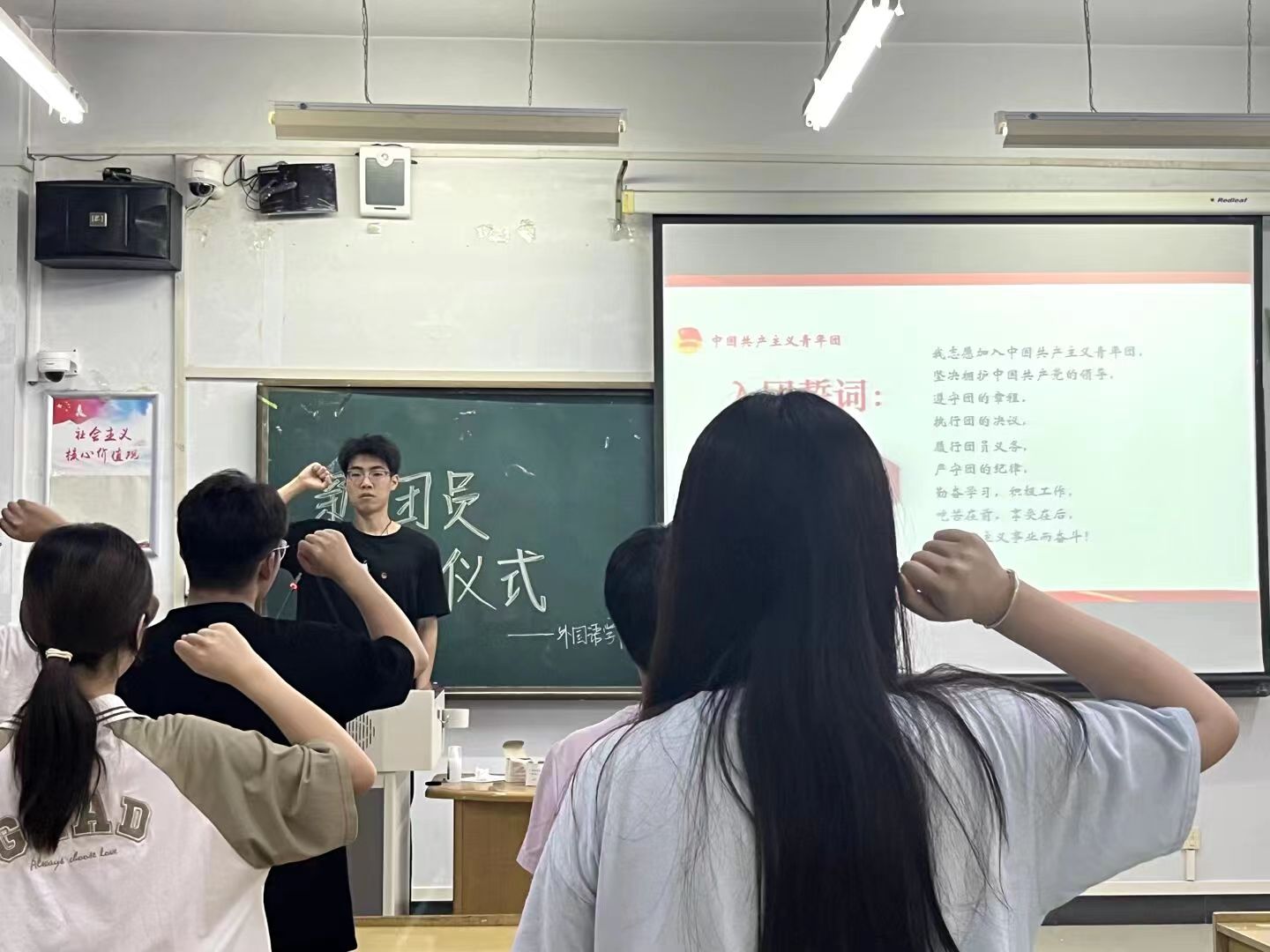 所有入团积极分子全部参与本次新团员入团仪式。伴随着嘹亮的团歌,新团员入团仪式拉开了序幕。“我们应做时代大潮流中的一滴水,为党和国家的发展尽自己的绵薄之力。”这是老团员代表王彬彦奉献家国的青春宣言。新团员代表王祎婧表示“加入共青团,不仅是一份荣誉,更是一份责任。我会在共青团的队伍里不断地锻造、磨砺自己,以自身行动践行对团组织立下的誓言”。最后,新团员代表信宇轩带领全体学生进行入团宣誓。宣誓时,新团员们情绪高昂,精神饱满,体现了新团员们奉献家国、不负组织的坚定信念。