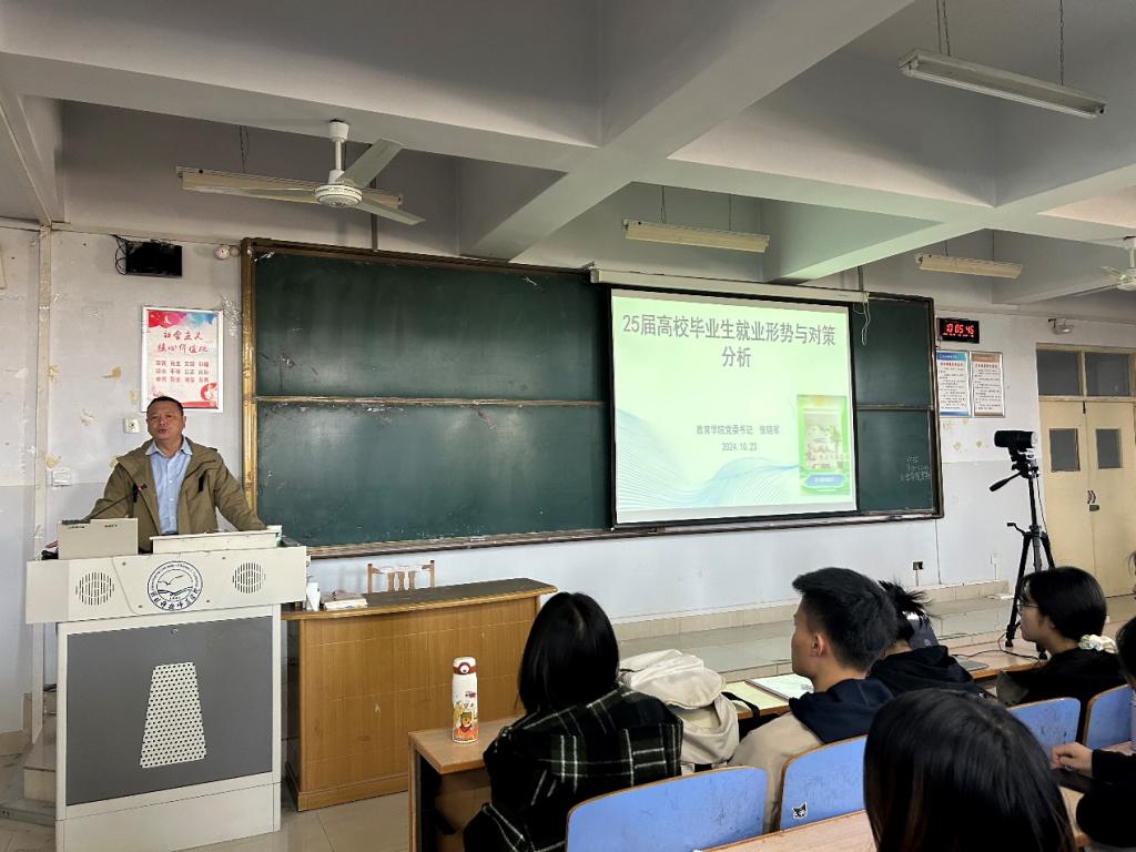 为了让同学们充分了解就业形势,合理规划职业发展路径,2024 年10月23日,澳门十大信誉好的网站邀请教育学院张晓军书记作《25届高校毕业生就业形势与对策分析》专题宣讲会。讲座由澳门十大信誉好的网站党委负责人主持,2021 级及2022级全体在校生300余人聆听了讲座。