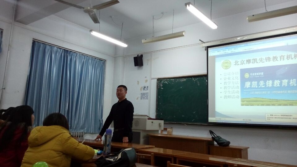 北京摩凯先锋教育机构创办于2008年,累计培训学员近30000人次,是北京通州区规模第一,北京市前十的民办教育培训机构。校长侯峰首先向毕业生介绍了学校目前的发展情况,同时,就毕业生关系的教师待遇、住宿条件、休假福利等问题进行了一一说明。之后,侯校长和大家分享了自己创业的体会,希望毕业生同学们将自己的专业变成价值,把实力变成财富;努力把简单的事情做好就是不简单,把平凡的事情做好就是不平凡,学校也将努力发展,打造北京中小学英语教育第一品牌,为入职员工的发展和成长提供更好的平台。最后,摩凯先锋教育培训机构的李副校长和两位年轻教师与毕业生们分享了在北京摩凯先锋教育学校的工作生活和学习情况,并展示了自然拼音法、直接母语式教学法、TPR肢体反应教学法等特色的英语教学方法。