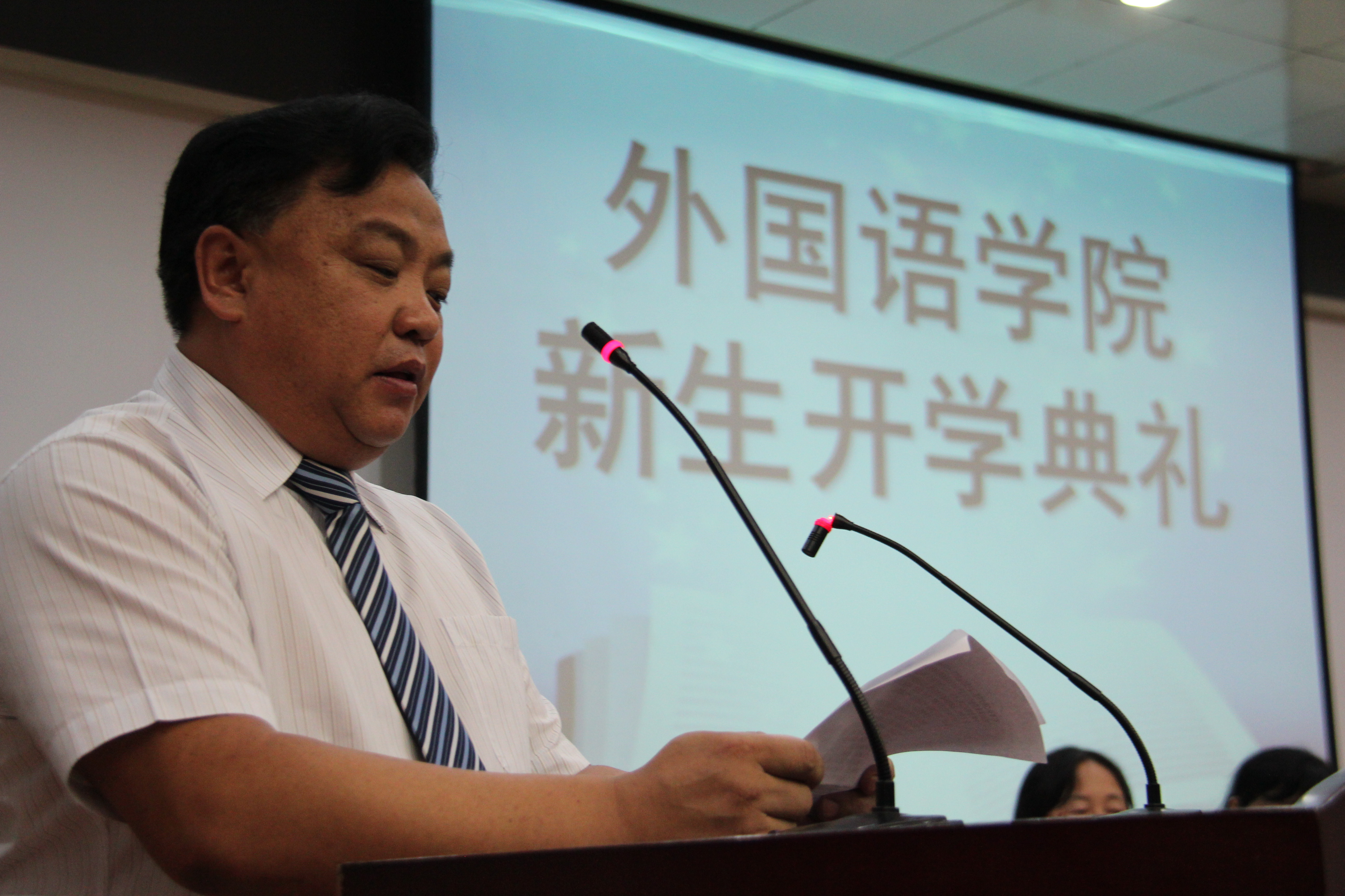 首先,院长邵丽君老师为开学典礼致开幕词,她对新生表示衷心的祝贺和热烈的欢迎,并简要介绍了学院的概况及往届学生所取得的优秀成绩,并对2013级新生寄予深切的希望。澳门十大信誉好的网站李爽老师代表全体教师讲话,表达老师对学生的关心嘱托和期望。老生代表杨楠同学和师弟师妹们分享了大学的生活经验。新生鲁宁同学代表全体新生畅谈了自己对大学的憧憬和梦想。之后,澳门十大信誉好的网站各教学部主任及专业教师代表分别用英语、日语、意大利语、俄语、法语等专业语言以向新生致以祝愿,形式新颖,令全体新生耳目一新。最后,澳门十大信誉好的网站党委书记白雪松老师用亲切的语言表达了对新生最热切的希望,他要求学生科学规划人生,加强知识储备;加强个人修养,增强事业心和责任感;常怀感恩之心,用知识和学识去回报社会;要努力奋斗,勇于创新创造。