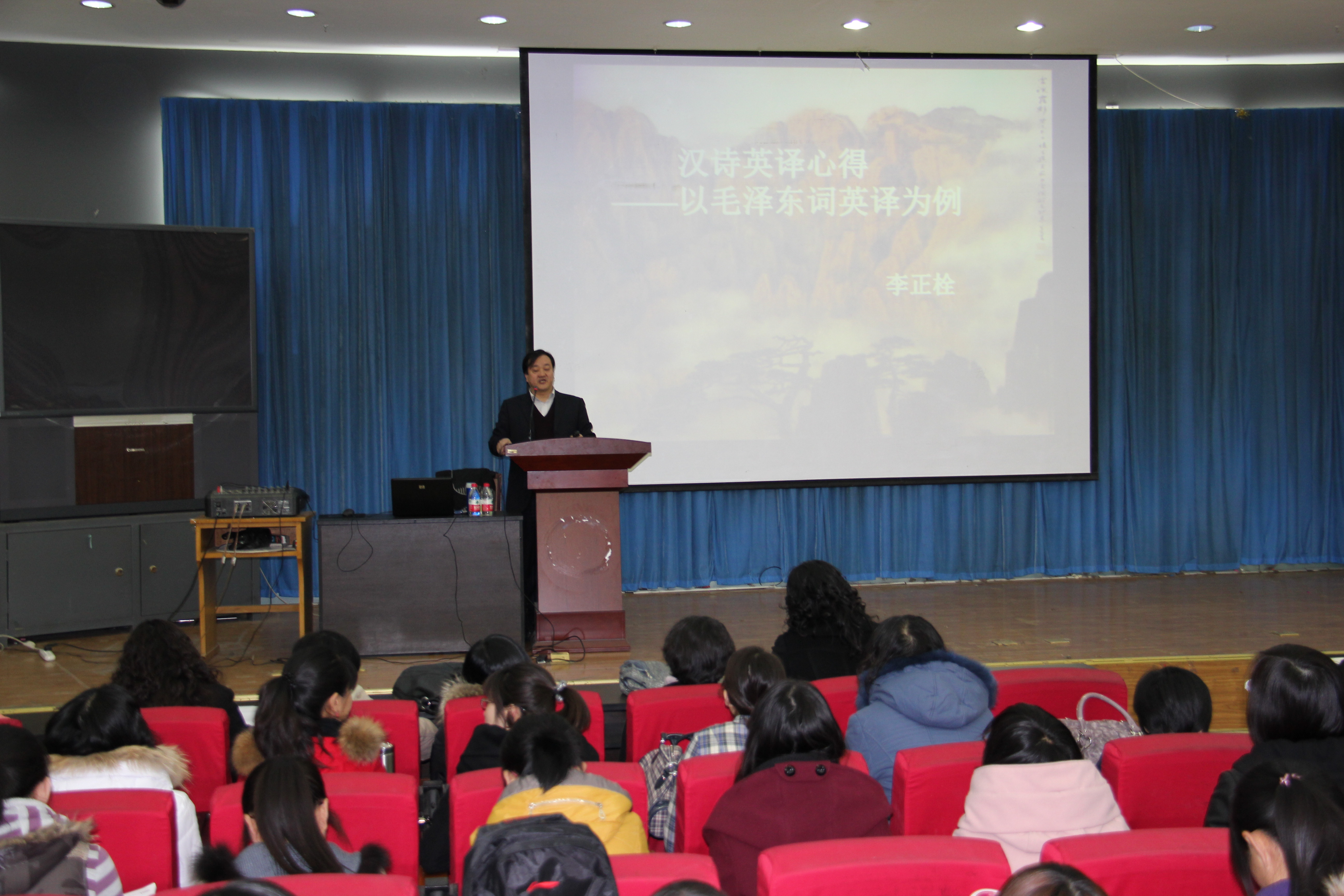 3月11日上午9点,在十大信誉官网开发区校区综合楼二楼报告厅,河北师范大学澳门十大信誉好的网站院长、硕士研究生导师、河北师范大学学术带头人李正栓教授为十大信誉官网澳门十大信誉好的网站的师生们做了一场题为《汉诗英译心得——以毛泽东词英译为例》的报告。