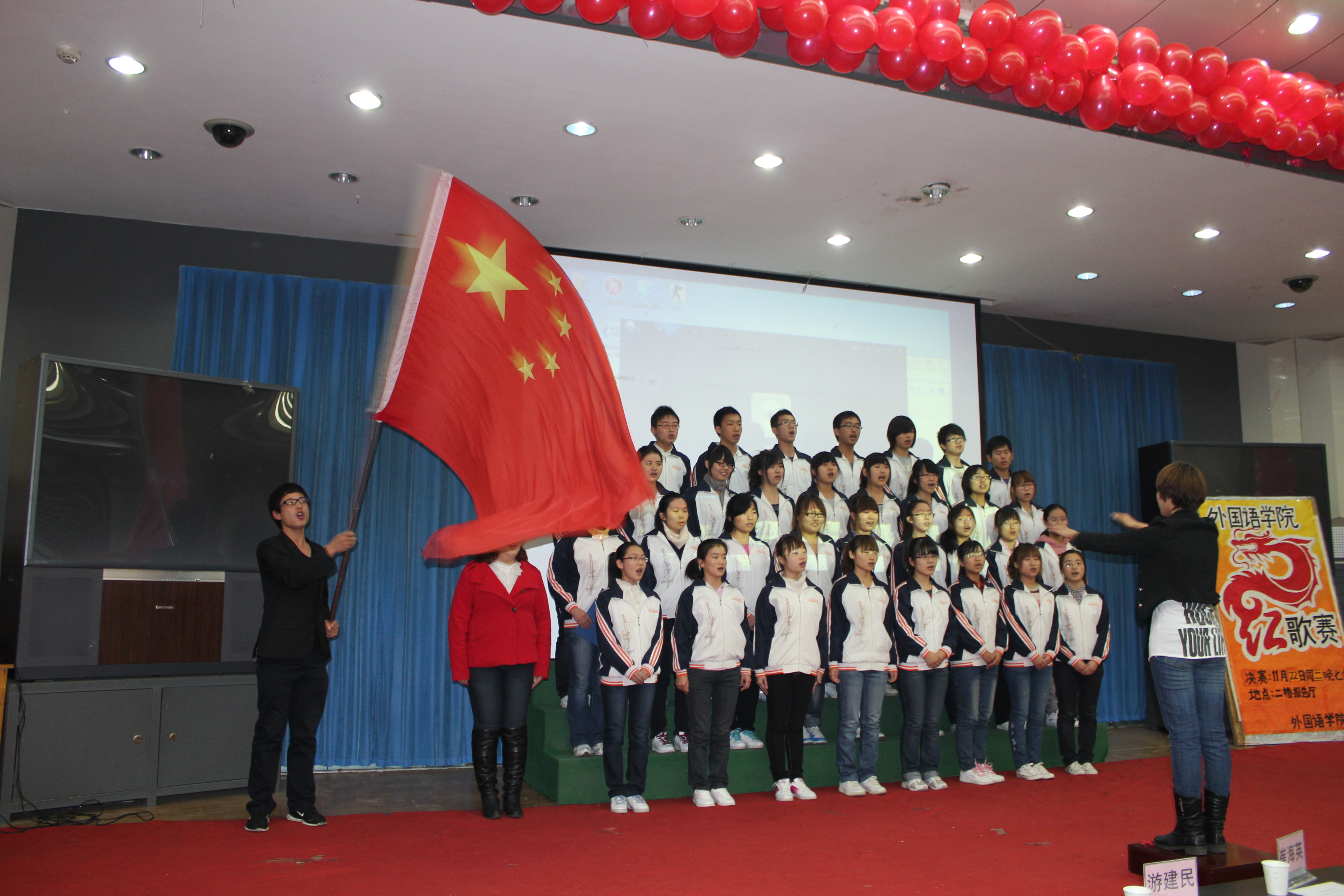 比赛在观看国庆大阅兵的庄严氛围中隆重开幕。参加比赛的班级为师生们带来了一场别开声面的视听盛会,比赛中学生们激情饱满,活力四射。旋律优美动人心弦,歌声嘹亮铿锵有力。《红色娘子军》、《国家》等一首首耳熟能详的红色歌曲唱出了同学们敢为人先,争创一流的时代风采,激起了大家对党对祖国的无限热情。手语、朗诵、武术、歌曲串烧、短话剧等多种多样的形式把比赛一次次推向高潮,台下不时爆发出热烈的掌声和激情的呐喊声。经过激烈的角逐,英本1001班最终以总分第一的成绩荣获桂冠,旅游英语1002班及英本1002班获得季军。