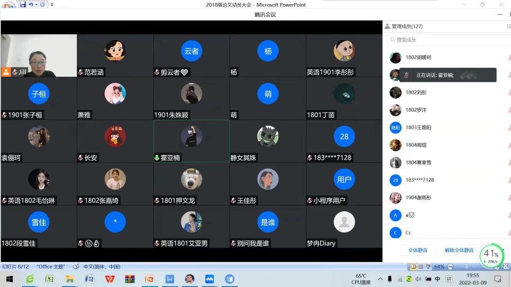 会议以腾讯会议形式召开,2018级和2019级英语专业学生共120余人参加。会议由教学部主任王静主持,首先介绍论文中期答辩安排,之后霍亚楠结合自己的经验,讲述了毕业论文撰写和考公、考编的注意事项,激励同学们认真对待,放松心态。会后的答疑环节中,同学们踊跃提问,积极向学长和老师请教。