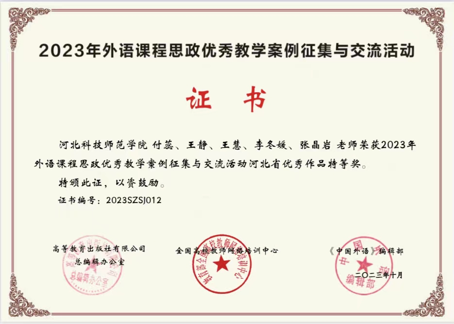 为全面推进高校外语课程思政高质量建设,落实立德树人根本任务,高等教育出版社于2023年4月启动外语课程思政优秀教学案例评比活动,经过专家委员会评审,十大信誉官网付蕊老师团队获得省级特等奖。