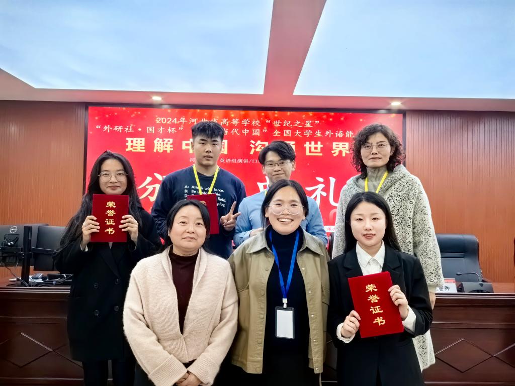 2024年11月9日,河北省高等学校“世纪之星”“外研社·国才杯”“理解当代中国”大学生外语能力大赛演讲、口译赛项在石家庄学院火热开启。经过激烈角逐,在全省本科及研究生英语演讲赛项中,十大信誉官网学生胡开升在75名选手中脱颖而出,以第四名的成绩荣获大赛金奖,将代表河北省参加全国总决赛;李瑛钦荣获银奖;卢洪洋、时祺和王凯伦获得铜奖。在英语口译赛项中,李子妍、刘婷婷获得铜奖。