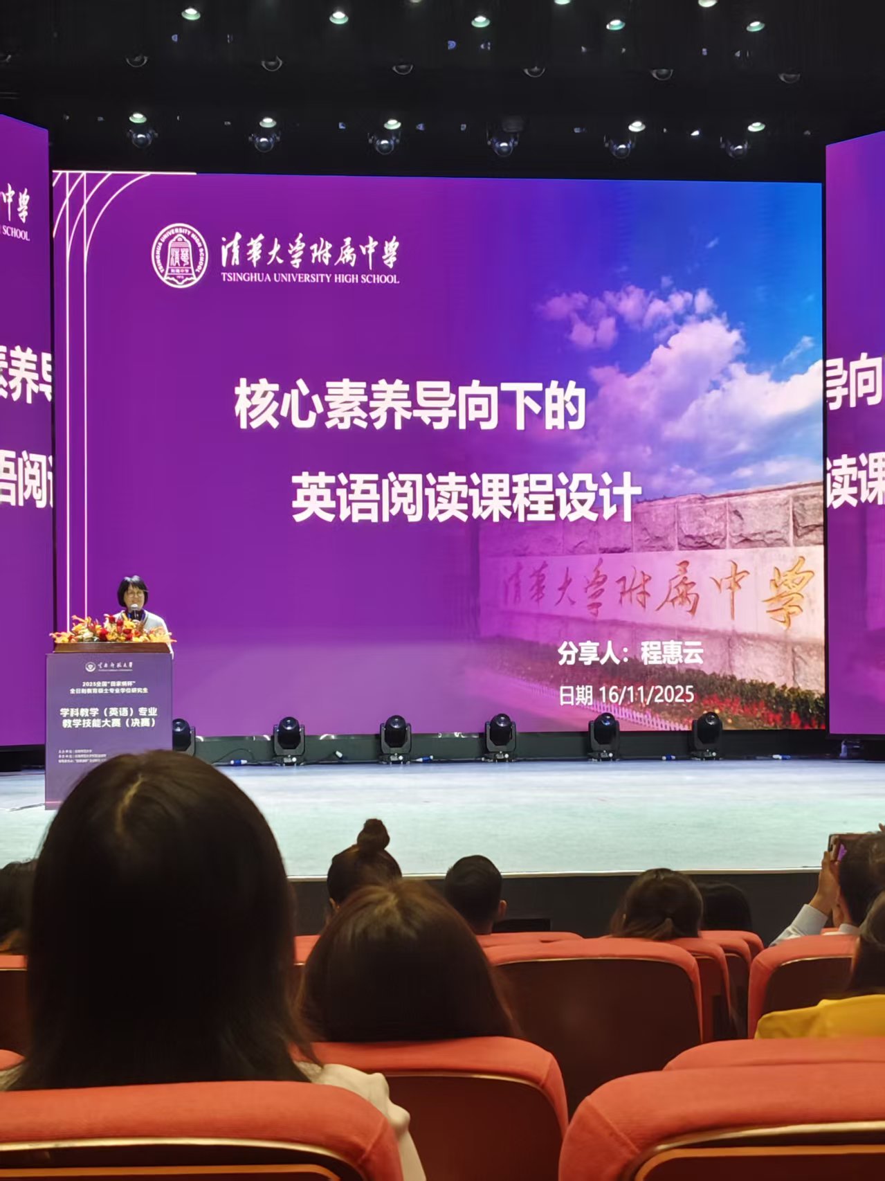 与决赛同步进行的学科建设专题研讨会,以“融合·赋能·共生:数字化转型下学科教学(英语)专业建设”为主题,吸引了众多高校教师、研究者和一线中小学教师参与。研讨会内容充实,议题前沿。南京师范大学蒋宇红教授作了题为“从教师中心,到学生中心,再到主体间性外语教学模式”的专题报告,深刻阐释了教学理念的演进与实践转型;清华附中程惠云老师则围绕“核心素养导向的英语阅读课程设计”进行了精彩分享,提供了丰富的教学案例。