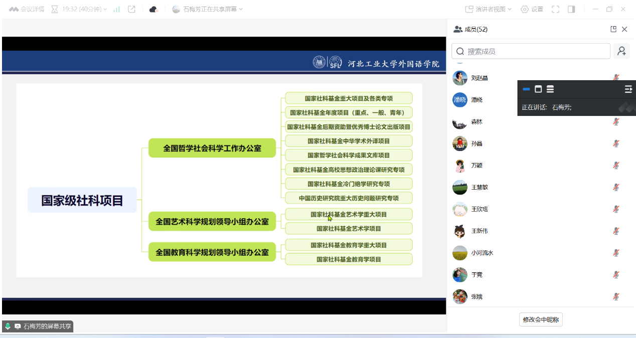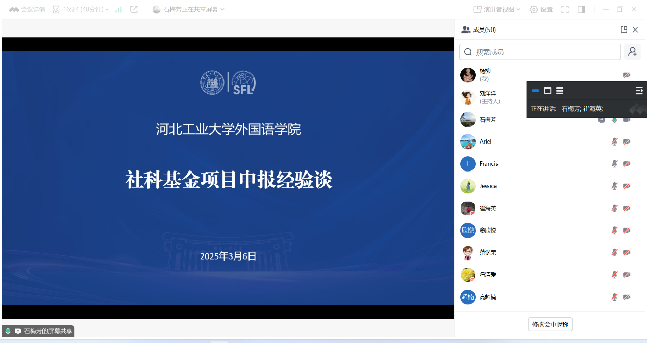 2025年3月6日,十大信誉官网举办“2025年度国家(省)社科基金项目申报专题讲座(十一) ”系列活动,邀请河北工业大学澳门十大信誉好的网站石梅芳教授作题为《社科成果奖申报经验分享》的专题讲座,崔海英院长主持会议,全体教师及在读研究生参会。